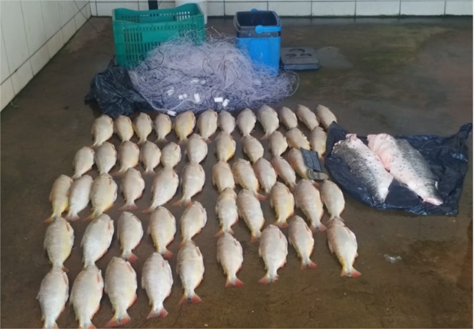 Em diligências, o veículo foi encontrado próximo ao Trevo do Lagarto, conduzido por um homem. Durante a busca veicular, a equipe localizou uma caixa térmica contendo duas bandas de pescado, aparentando ser da espécie pintado. Próximo à caixa térmica, também foi encontrado um saco plástico com uma rede de emalhar de cerca de 60 metros de comprimento.