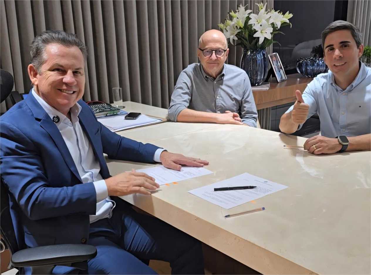 O governador Mauro Mendes junto do vice Otaviano Pivetta e do secretário Alan Porto – Crédito – Lucas Rodrigues/Secom