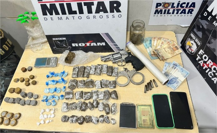 Policiais militares do Batalhão de Rondas Ostensivas Tático Móvel (Rotam) prenderam um homem, de 24 anos, por tráfico de drogas, na noite desta segunda-feira (13.10), em Cuiabá. Com o suspeito, foram encontrados um simulacro de revólver, cinco munições, 72 porções de drogas e uma quantia de R$1.1OO em dinheiro.