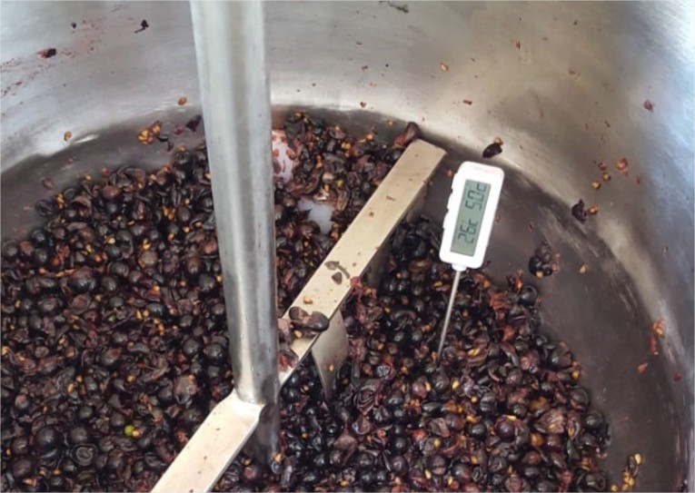 A técnica de termovinificação foi otimizada pelo grupo de pesquisa. O método utilizado consiste em aquecer as uvas a cerca de 65 °C por duas horas, favorecendo a degradação de compostos fenólicos, eliminando microrganismos indesejáveis e diminuindo a atividade das enzimas pectinolíticas.