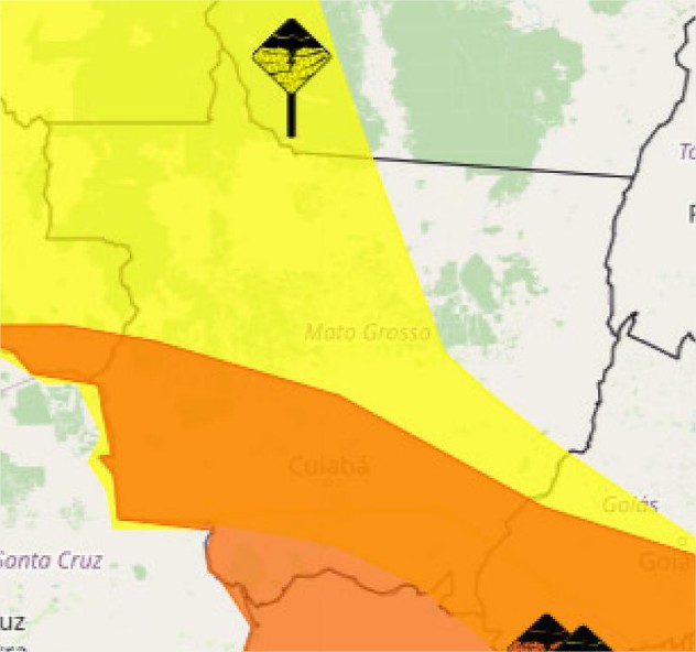 No município de Rondonópolis, também sob alerta laranja do Inmet, a temperatura pode chegar à casa dos 37 °C ainda no fim desta manhã. À tarde, o tempo fecha e pode haver pancadas de chuva intensa.