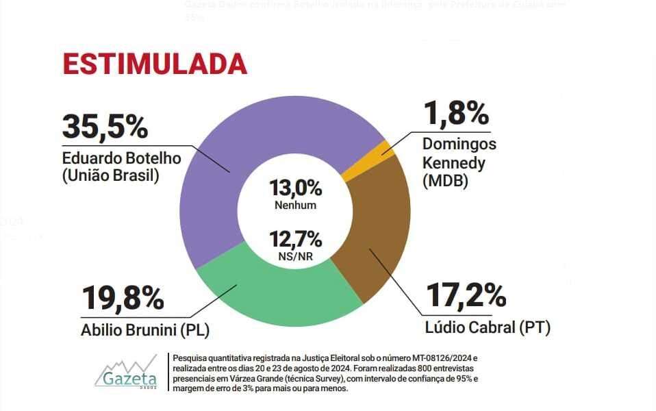 Pesquisa do instituto Gazeta Dados confirma a liderança isolada do candidato Eduardo Botelho (União) na disputa para prefeito de Cuiabá, com 35% das intenções de votos,...