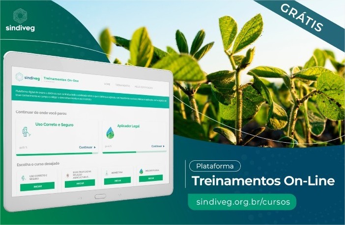 Para ampliar o acesso à informação e incentivar boas práticas no uso de defensivos agrícolas, o Sindiveg mantém uma plataforma on-line gratuita com diversos cursos e treinamentos. Os conteúdos abordam temas como: