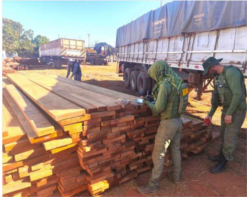 Dois motoristas foram conduzidos à delegacia pelo transporte de madeira da espécie Castanheira. O corte dessa espécie é proibido pela Lei Complementar Estadual n. 233/2005 e é considerado crime ambiental.