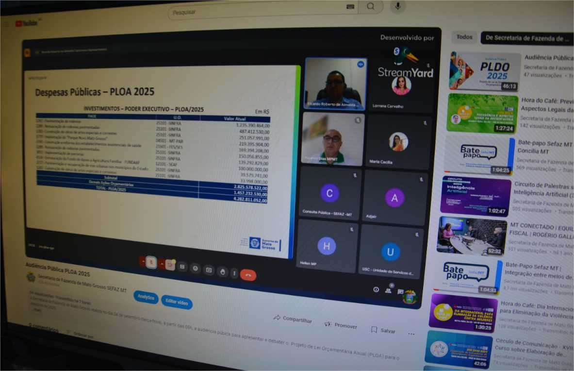 O PLOA contempla as receitas e despesas estimadas do Governo do Estado, além de informações sobre investimentos, renúncia fiscal, operações de créditos e indicadores macroeconômicos. Os dados foram apresentados durante a audiência pública virtual, transmitida pelo canal da Sefaz-MT, no YouTube.