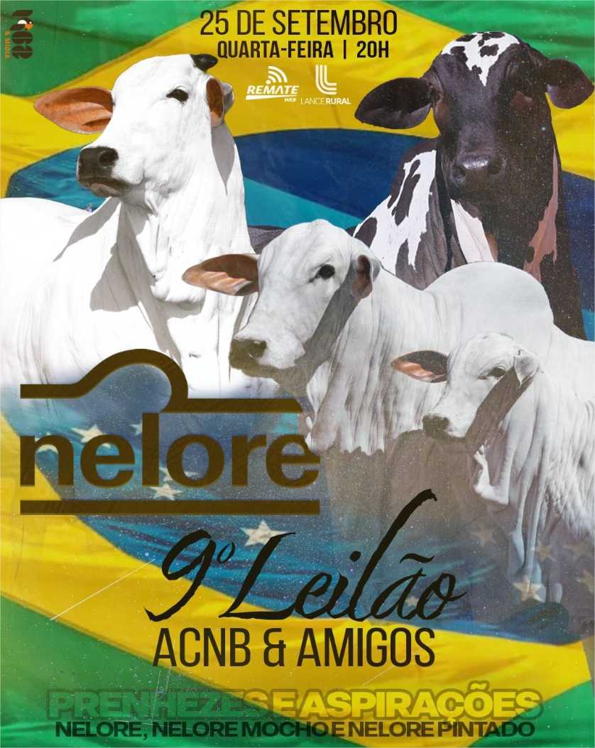 A Associação dos Criadores de Nelore do Brasil (ACNB) realiza o 9º Leilão ACNB e Amigos no próximo dia 25 de setembro, em formato virtual. Serão ofertadas prenhezes e aspirações de matrizes consagradas da raça Nelore, incluindo as variedades Nelore Mocho e Nelore Pelagens (ou Nelore Pintado). O evento começa às 20 horas (horário de Brasília).
