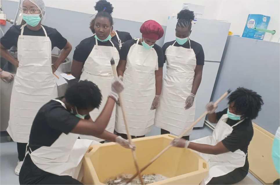 A equipe chegou no país africano no dia 23 de janeiro e retorna ao Brasil em 3 de fevereiro. O curso foi aplicado no Instituto do Emprego e Formação Profissional para 15 mulheres da região. Durante as aulas, as participantes aprenderem técnicas de curtimento, preparação, tingimento e acabamento da pele do peixe para transformar em couro.
