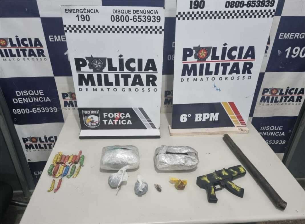 Equipes do 6º Batalhão e da Força Tática do 6º Comando Regional apreenderam um adolescente, de 17 anos, membro de uma facção criminosa, por tráfico de drogas, na noite deste domingo (23.2), em Cáceres. Com o menor, a PM apreendeu porções grandes de maconha, uma arma de brinquedo e 16 explosivos de artifício.