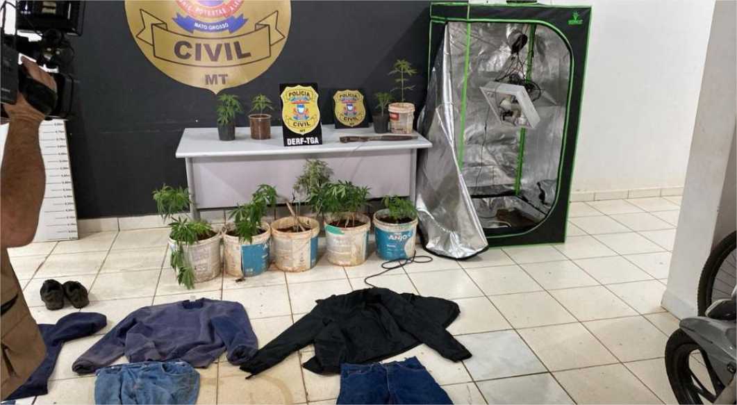 Durante as buscas na residência de um dos menores, os policiais localizaram uma estufa improvisada com vários pés de maconha, caracterizando também contravenção análoga ao tráfico de entorpecentes.