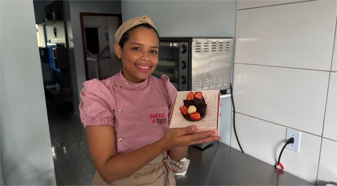 A confeiteira artesanal Alexia Silva, proprietária da Totus Tuus, em Várzea Grande, contou com o apoio da Desenvolve MT para impulsionar a produção de ovos de páscoa e melhorar a estrutura do negócio. A empresária conseguiu aprovação do crédito da linha Mulher Empreendedora, em janeiro deste ano, após ser indicada por uma amiga.