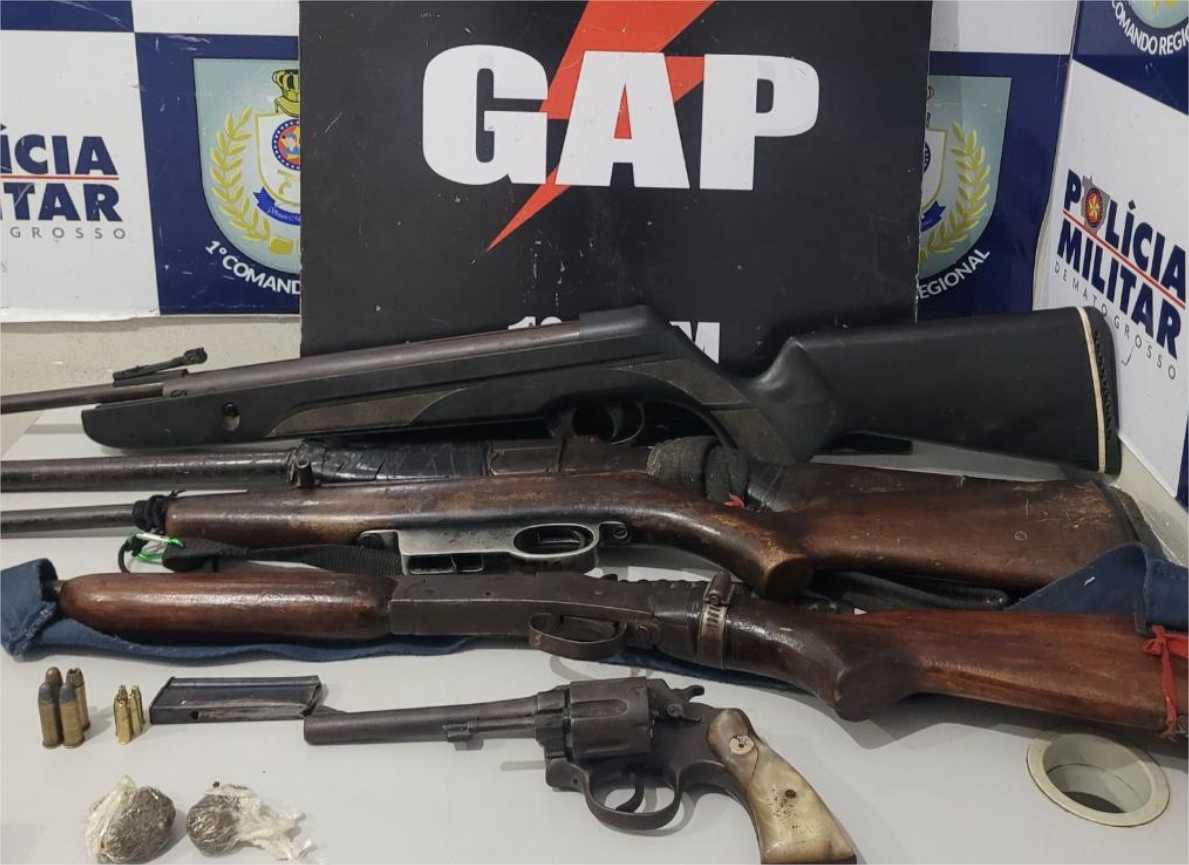 Ainda na casa, o homem entregou um revólver de calibre .38 que estava escondido no sofá e mais três espingardas, sendo uma arma de pressão, que estavam em seu quarto. Também no local, foram apreendidas munições de todo o armamento e duas porções de maconha.
