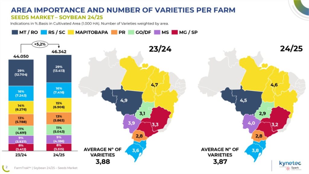 Ainda conforme o FarmTrak Soja 2024-25, Mato Grosso continua o principal estado produtor da oleaginosa, com 28% da área cultivada, seguido por Rio Grande do Sul (14,3%), Paraná (12,7%) e Goiás (11%). “Os estados agrupados ‘bamatopipa’ representaram mais de 15% do plantio. Formam hoje a principal fronteira de expansão da sojicultura, com crescimento de 9%, um indicador situado bem acima da média de outras regiões”, conclui Cristiano Limberger.