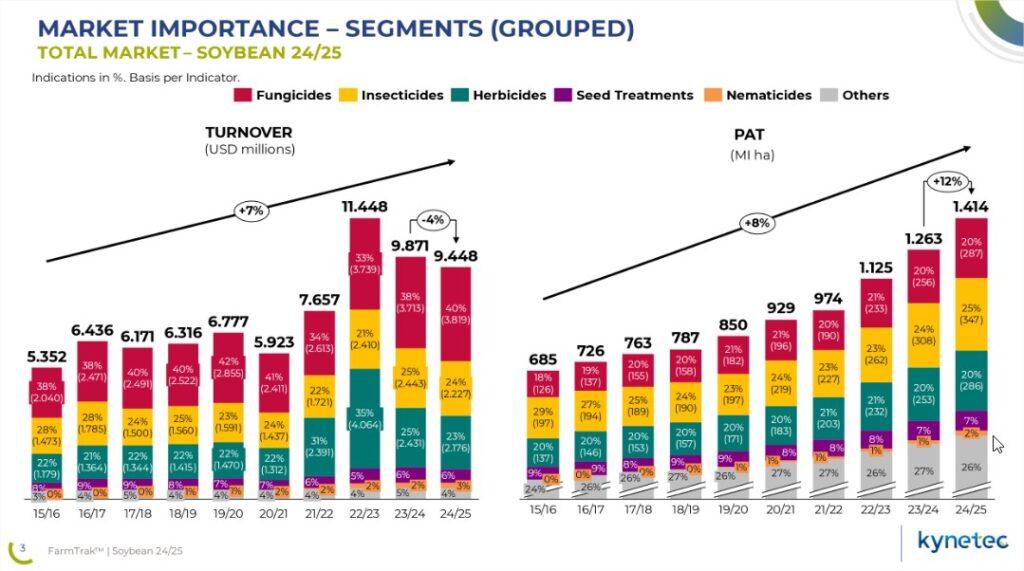 Valinhos (SP) – Levantamento exclusivo da Kynetec Brasil, o FarmTrak Soja da safra 2024-2025 registrou recuo de 4,3% na movimentação do mercado de defensivos agrícolas para a oleaginosa. Foram transacionados US$ 9,45 bilhões em produtos, ante US$ 9,87 bilhões do ciclo 2023-24. Em contrapartida, a área potencial tratada (PAT) pelas tecnologias para a proteção do cultivo apresentou crescimento relevante de 12% e passou de 1,4 bilhão de hectares, novo recorde, segundo o especialista em pesquisas da empresa, Cristiano Limberger.
