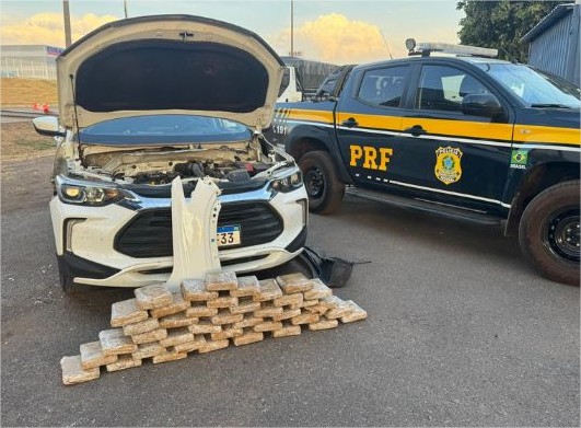 A equipe abordou um veículo Chevrolet/Tracker, de cor branca, que transitava pela rodovia. Durante a inspeção, os policiais localizaram um compartimento oculto, especificamente preparado e dissimulado, na região do painel corta-fogo, com acesso pelo para-lama dianteiro direito. No interior, foram encontrados 40 tabletes da droga, que após pesagem oficial pela Politec totalizaram 44,5 kg.