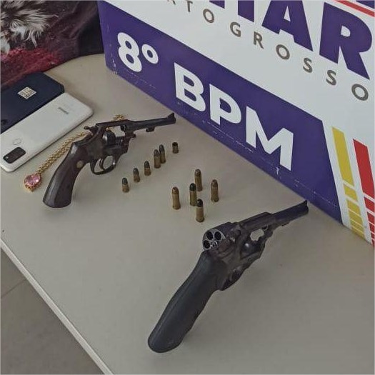 A equipe do 8º BPM iniciou diligências nas redondezas da casa e prontamente encontraram os suspeitos fugindo em uma estrada, que passa pela parte de trás da residência. Rapidamente a dupla foi abordada e se rendeu. Com eles, foram localizados dois revólveres e uma corrente.
