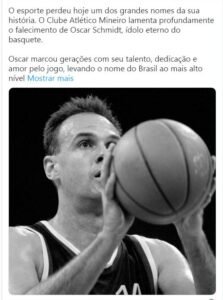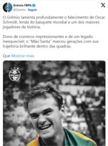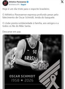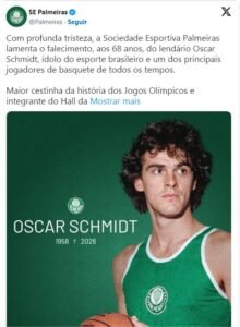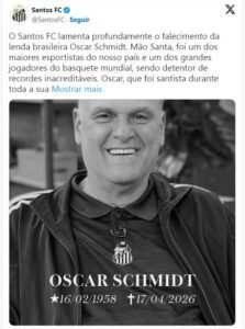 Faleceu nesta sexta-feira (17/4) a lenda do basquete brasileiro, Oscar Schmidt, aos 68 anos. O ex-jogador, presente no Hall da Fama dos Estados Unidos, sofreu um mal-estar em casa e foi de ambulância ao Hospital e Maternidade Municipal Santa Ana (HMSA), em Santana de Parnaíba (SP), próximo de sua residência. A informação foi dada em primeira mão pelo jornalista Léo Dias. A causa da morte, no entanto, não foi divulgada. Ele lutava contra um câncer no cérebro desde 2011.