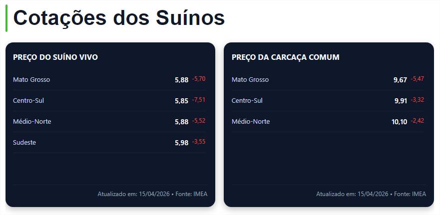 Assim como na avicultura, a ração também tem peso determinante na suinocultura, respondendo por 72,22% dos custos totais. Em março, esse item registrou queda de 0,55%, acumulando recuo de 1,96% no ano.