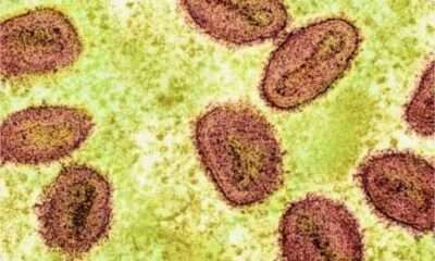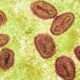Micrografia eletrônica de transmissão colorida de partículas do vírus mpox (vermelho) encontradas dentro de uma célula infectada (verde), cultivada em laboratório. Foto: NIAID A...
