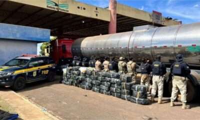 Reprodução/PRF A Polícia Rodoviária Federal (PRF) apreendeu 878 quilos de entorpecentes escondidos em uma carreta Scania que carregava oléo vegetal. O motorista foi preso. O...